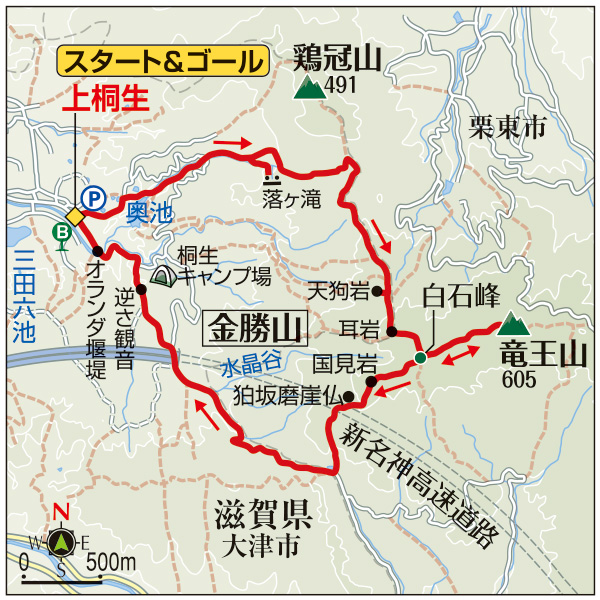 上桐生バス停(一丈野駐車場)から、落ヶ滝を通って稜線に登り、天狗岩、耳岩を通って金勝アルプスの最高峰、竜王山へ。白石峰から狛坂磨崖仏を経て南谷林道へ下り、オランダ堰堤を通って起点へ戻る周回コースが、盛りだくさんに楽しみが詰まっていておすすめだ。