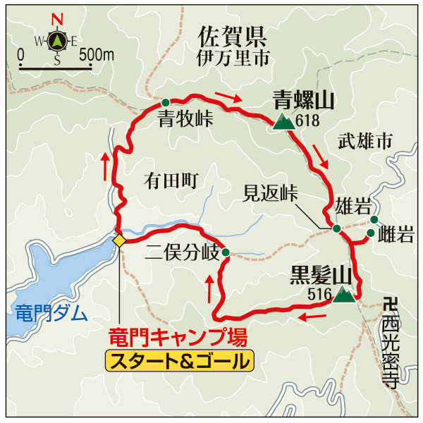 登山口は竜門キャンプ場。広い駐車場、トイレ、自動販売機があり便利に使える。公共交通機関の場合、最寄りの松浦鉄道西九州線西有田駅からは約4kmあるが路線バスはない。タクシーを利用しよう。