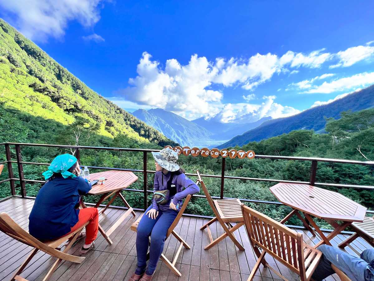 岳沢小屋が目的地でも、ぜったいに満足できます。西穂、ジャンダルム、奥穂、前穂、明神岳、そして上高地に囲まれた、ここだけの絶景テラスでくつろぎの時間を!