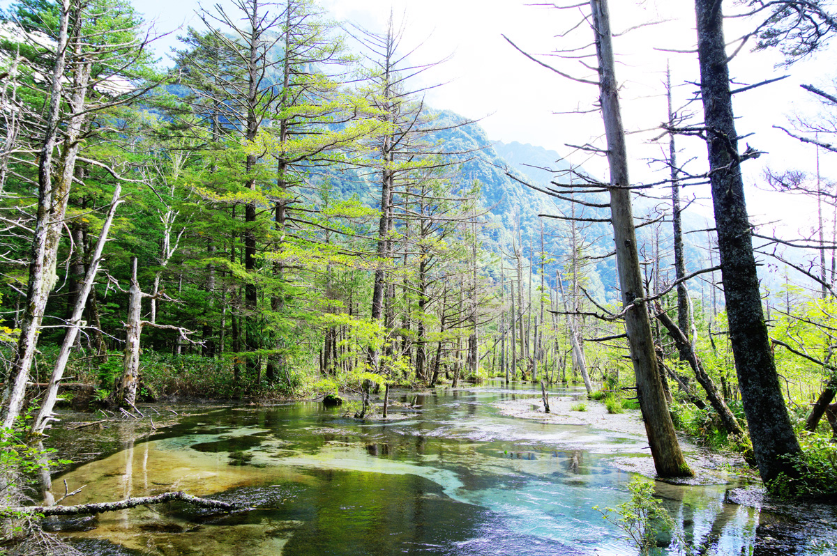 上高地は通年マイカー規制。松本方面からは沢渡駐車場、高山方面からはあかんだな駐車場でバス乗り換え。東京や名古屋、大阪、松本駅からは路線バスや直行バスの運行もある(春から秋のみ)。