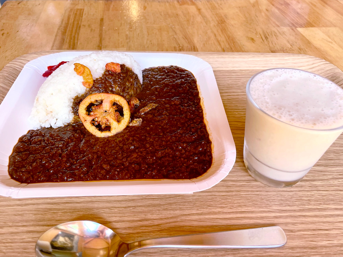 槍ヶ岳山荘グループオリジナル、ココナッツ風味の辛~いブラックキーマカレーに、岳沢小屋名物の甘~い手作りバナナスムージーを添える。相性抜群のセット。カレーはおみやげ用も購入できる。