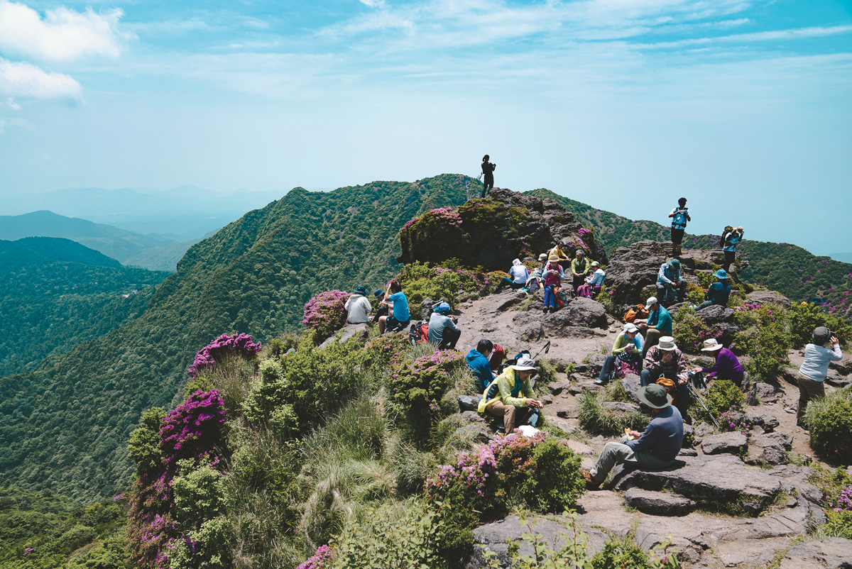 国見岳山頂まではハードな直登だが、ミヤマキリシマがわんさか咲いていて、まるでピンクの絨毯の上を歩いているよう。何度も足を止めながら登ると、360度の展望が広がる山頂にたどり着いた。ひと息ついて、普賢岳へ。国見分かれに戻り、急な坂を鬼人谷(きじんだに)へ向かって下った。