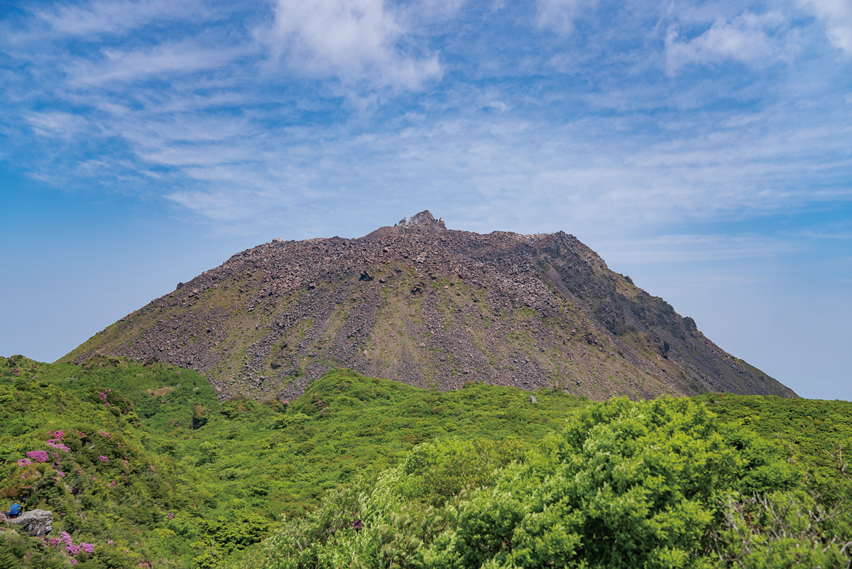 この日はまさに花見日和で、池ノ原園地から、足取り軽く仁田峠に向かって歩いた。私たちの目的はミヤマキリシマ。九州各地の高原に自生する、火山特有のツツジだ。一面ピンク色に染まった仁田峠へ着くと、「これは山の上も期待できるぞ」と胸が高鳴る。「ロープウェイでサクッと登って、山の上でゆっくりしよう」という話になり、観光客に混じってゴンドラに乗り込んだ。車窓からは仁田峠や雲仙温泉街が一望でき、標高1270mの妙見駅まであっという間に到着。ロープウェイを降り、妙見神社の裏手にある妙見岳(みょうけんだけ)山頂へ向かった。「あれが国見岳(くにみだけ)。普賢岳(ふげんだけ)も見えるね」。山頂は見晴らしが良く、これから登る山が手に取るように眺められた。