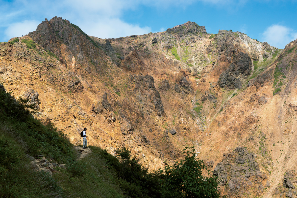 まずは山頂駅から緩やかな田た茂も萢やち岳だけを抜け、赤倉岳の断崖や井戸岳のダイナミックな噴火口を眺めながら歩く。大岳まではやや急登が続くが、