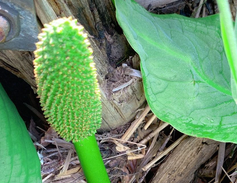 やがて季節が進むと、ミズバショウの印象的な白い仏炎苞は落ち、その仏炎苞に守られるようにして小さくひっそりと佇んでいた肉穂花序が、どんどん膨らんできます。周りの小さい葉っぱたちも光合成をするために大きく成長し、この肉穂花序に栄養を届けようと必死です。こうして肉穂花序の中にたくさんの種子が作られるのです。