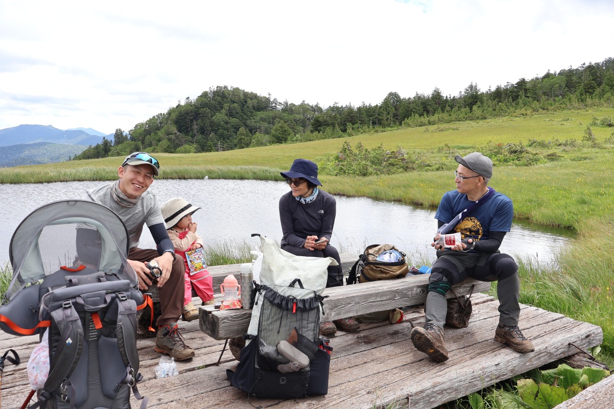 ▲家族みんな山好きのわが家。昨夏、尾瀬・長蔵小屋にて初めて3世代で山小屋泊。左から、荷物持ち係の夫、みんなの癒し係の娘、孫のお世話係の母、長時間運転係の父(にのみや)