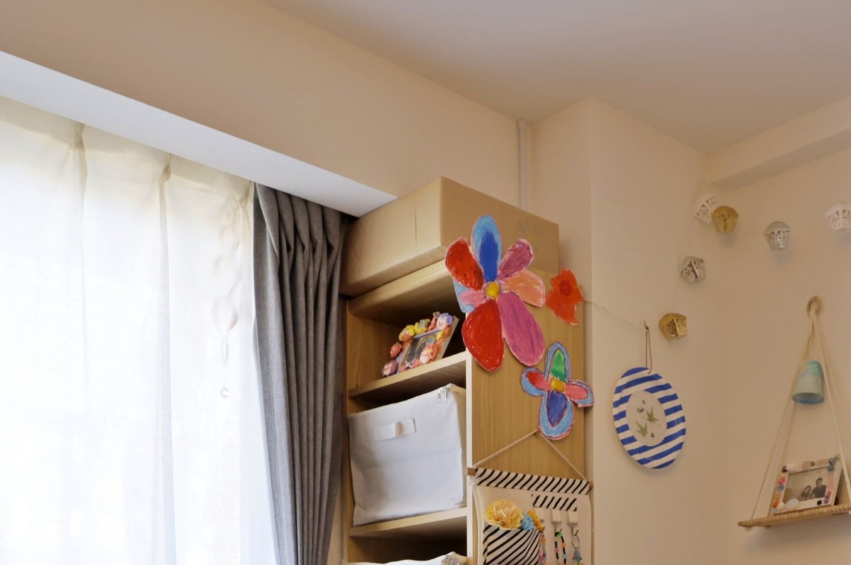 また、背の高い棚には天井とのすき間に段ボールを詰めて固定しています。段ボールの中身は古着や使い古しのタオルなどを詰めており、外側には子どもが自由に絵を書いて飾る感覚でストッパーの役割を果たしています。