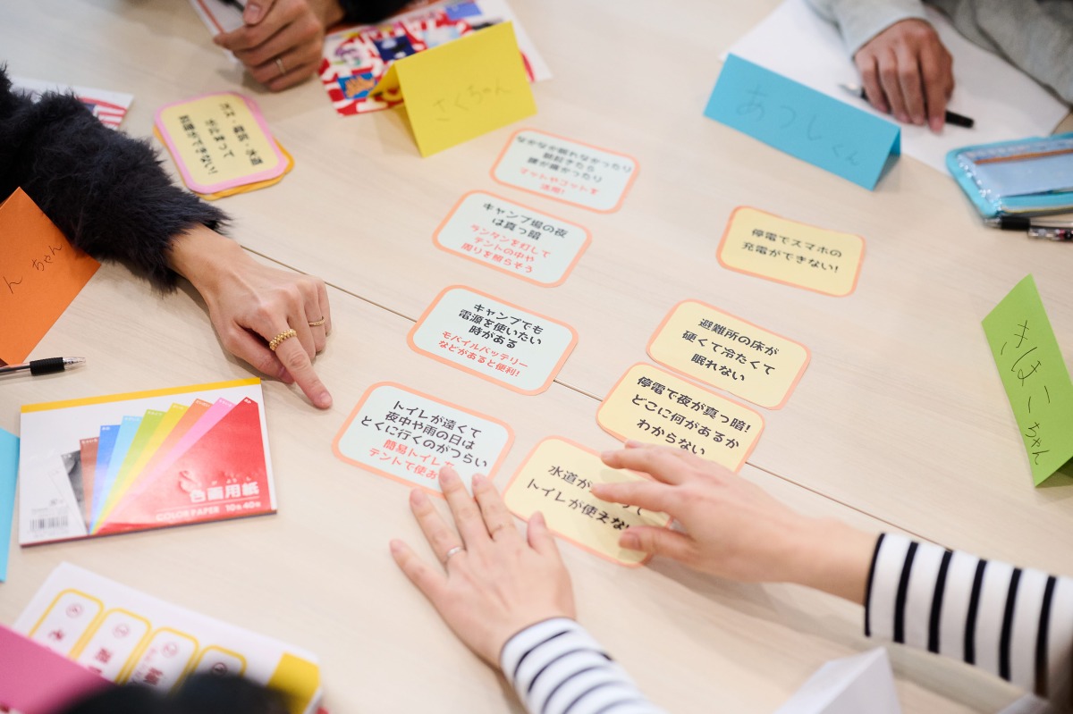 まずは、自分が暮らす場所の災害リスクや家の安全性、避難の種類などを確認しながら、災害時に必要なことを整理。そして、「衣・食・住・心」をテーマに、カードを使って防災とキャンプの共通点を見つけていきます。