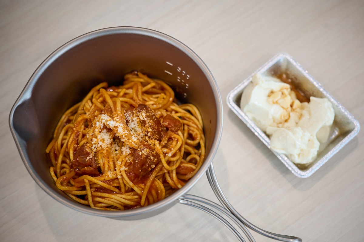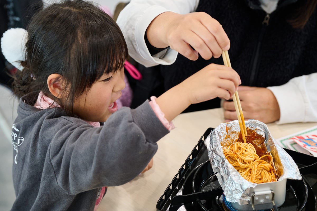 もっとも盛り上がったのが、「食」の体験。「水漬けパスタ」は、茹でる必要がないうえ、少ない火力で調理できるアウトドアにも非常時にもぴったりのレシピです。クッカーとパスタを前に、普段あまり料理をしない子も「やってみたい!」と目を輝かせます。親子でいっしょにパスタとソースを混ぜたり、火加減を調整したりしながら、完成!