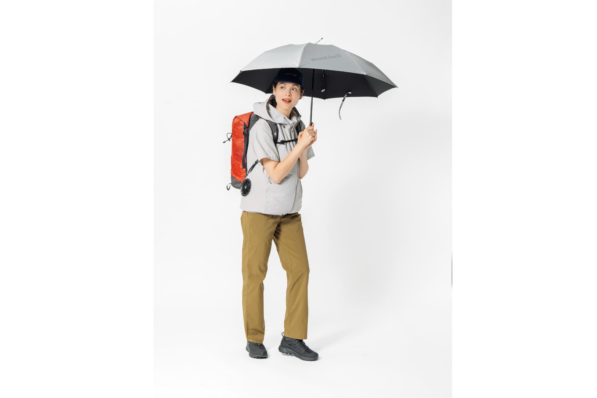 シンプルな定番コーデに見えるけれど、じつはこの半袖パーカは、暑い季節のアクティビティ時に重宝する送風ファン付き。荷物の重さが気になりにくい高原ハイキングなどで大活躍し、一度使うと病みつきになる。日差しの強い開けたフィールドでは、日焼けや熱中症予防に日傘を持つという方法も。