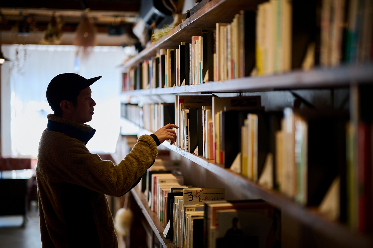1階は宿泊者以外も利用できるカフェバーになっていて、壁には本がズラリと並んでいる。こちらの空間では、この街に住むことを決めたオーナー家族への賛歌を歌った。