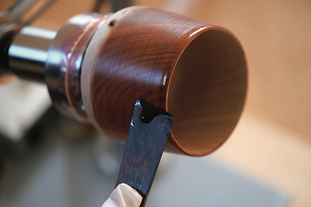 昌邦さんいわく、漆は280度でも溶出せず、氷点下でも凍らない。さらに、薄塗りの「摺り漆」という技法を使うため軽量だ。つまり漆器は、アウトドアでの使用にとても向いていると言える。機能面の特徴もさることながら、漆の下に透けて見える美しい木目、優しい口触りや手触りも魅力的。
