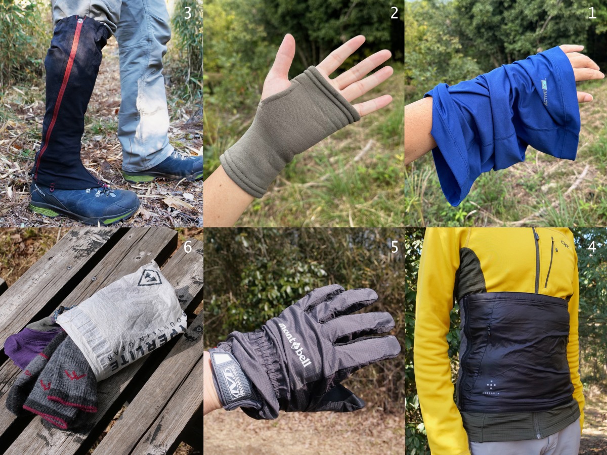 ■アイテム一覧:1)アウトドアリサーチのアーバーチューブ、2)フーディニのパワーリストゲイター、3)凌のクナイ、4)凌のクイックハラマキ、5)モンベル・グローブ用防風カバー、6)着替え