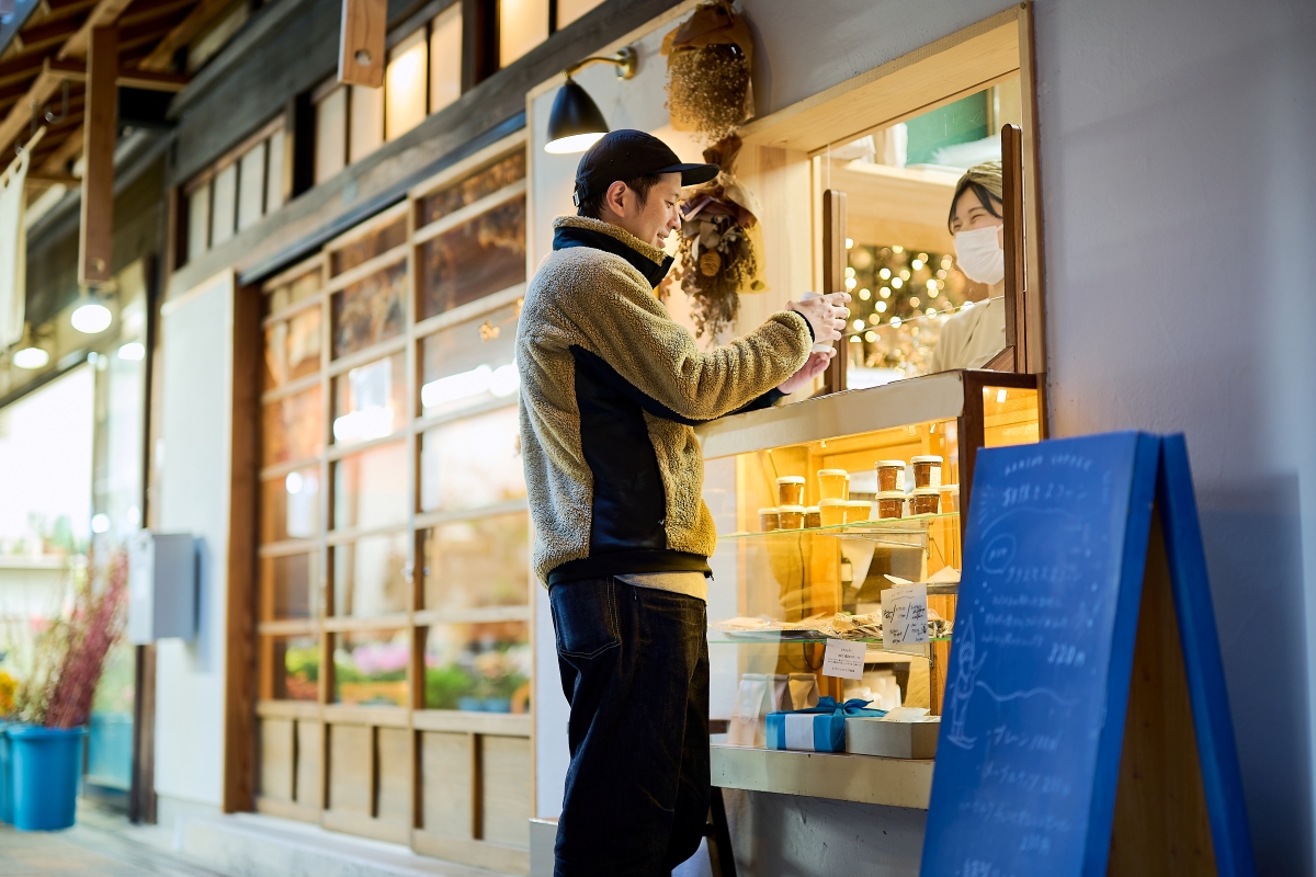 豊岡駅からメインストリートを歩いていると、右手に「ふれあい公設市場」という小さなアーケードが現れる。その中にある「KAMINO COFFEE」は、初めて豊岡を訪れたときから欠かさず行っている珈琲とお菓子のお店だ。焙煎も自分たちでしているこだわりの珈琲を片手に、豊岡の街を歩き始めるのがお決まりのコース。