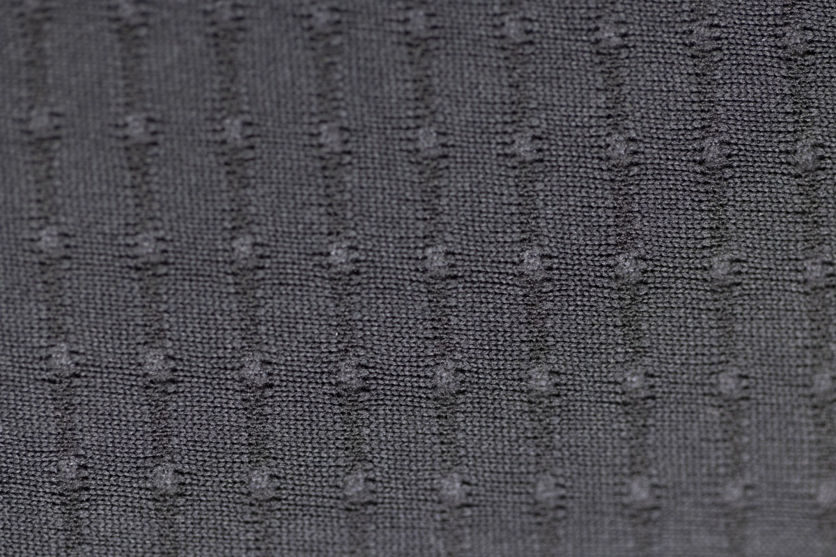 此﨑:これが生地の大きなポイントです。穴に見えるドット状の接結部分から汗を吸い上げて、外側へ吸水拡散する構造になっています。綿や一般的な化繊生地の場合、汗をかいたあとに肌が湿ったままになりがちですが、エクスペディションドライドットならベタつかず、さらりとした状態が続きます。
