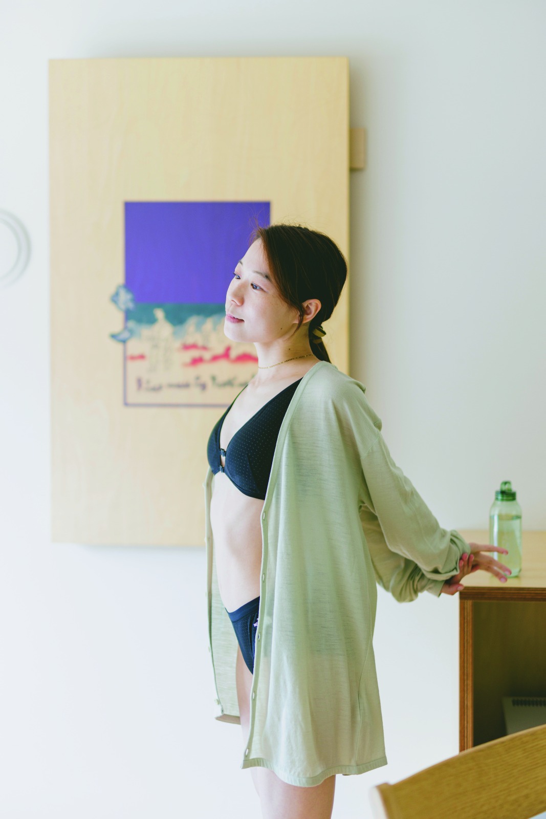 此﨑:はきこみ丈に余裕があるのが特徴です。丈が浅いと体に食い込みやすく、深いと動きやボトムに干渉しますが、こちらは絶妙な丈。タイトすぎず着心地もしなやかです。ウエストゴムも太すぎず、さらっとした肌触りでムレにくい。端の処理もフラットで、ボトムにラインが響きにくいのもポイントです。