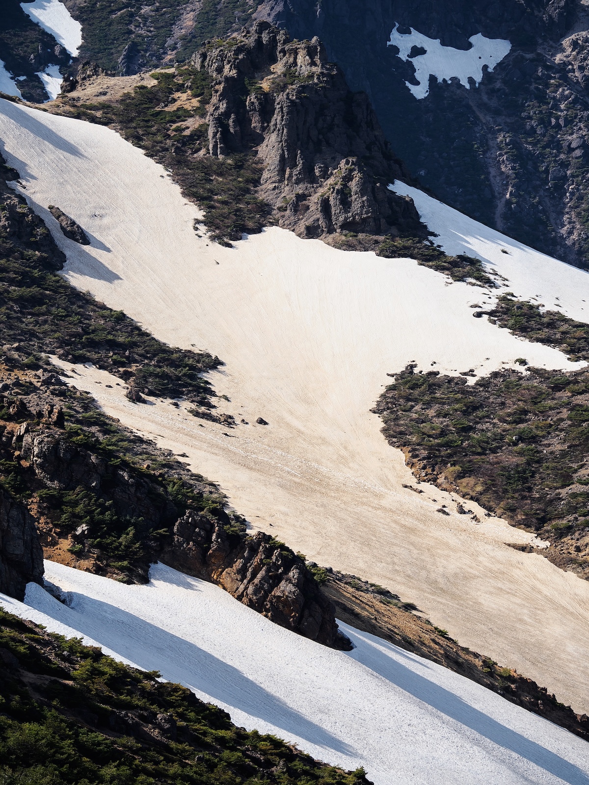 安達太良山の山頂直下にて。西日に照らされて暖色に染まった雪渓に惹かれ望遠ズームで狙った一枚。カラープロファイルのCOLOR2で色彩の厚みがある印象に仕上げました。