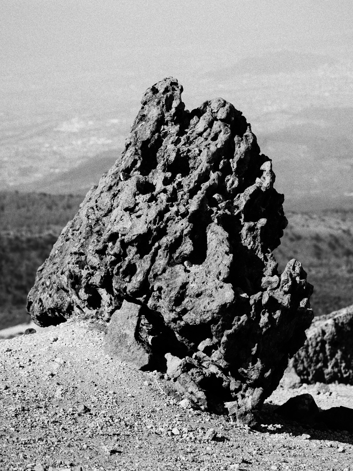 安達太良山の稜線で見かけたりりしい大きな岩。望遠ズームで岩を大きく捉えつつ、さらに存在感を強調するためにモノクロプロファイルのMONO2で陰影を強く出しました。