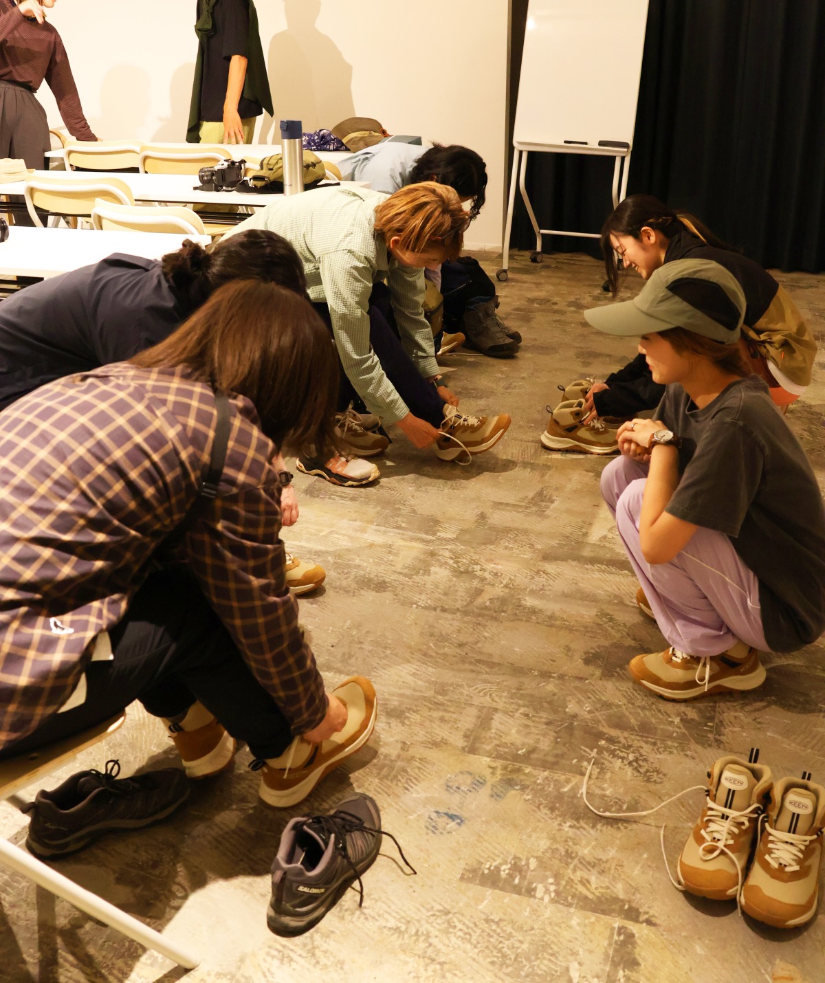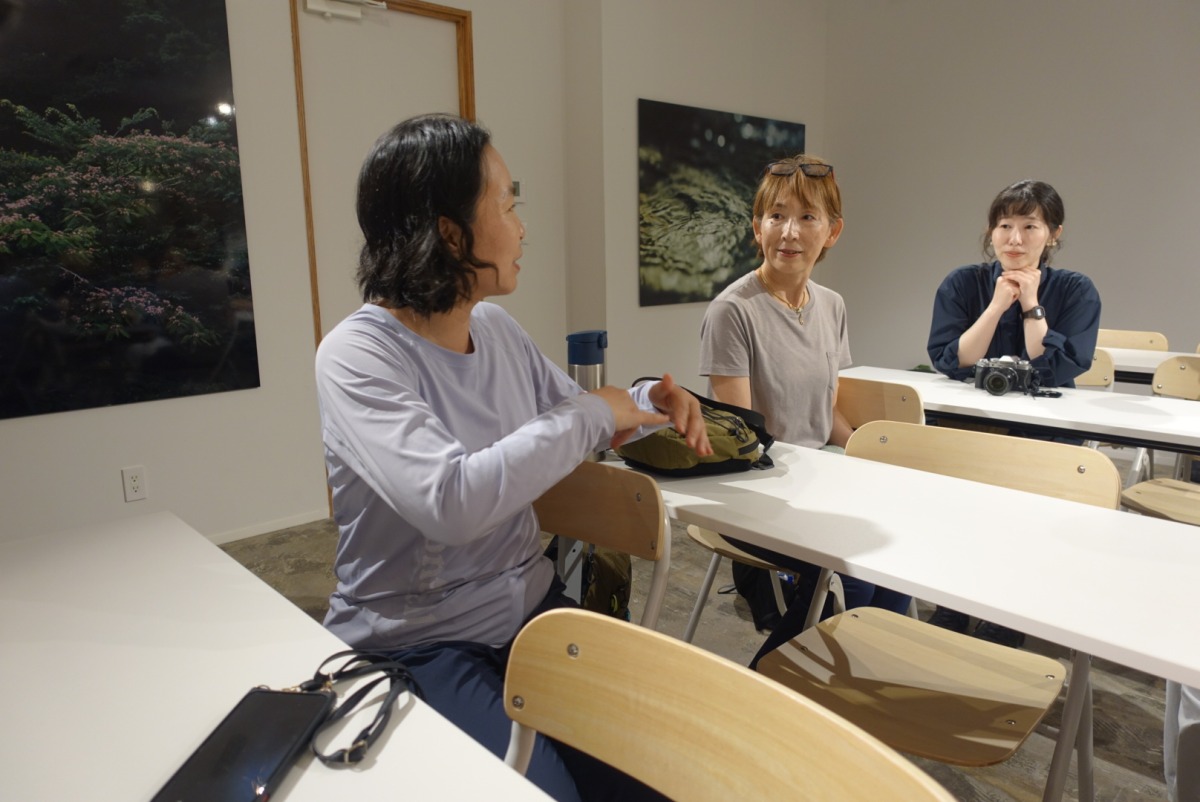 下山後は、参加者のみなさんとシューズの着用感などについてを共有。「ソフトな履き心地で、ミドルカットだけど足首が固定されすぎず、動く感じが箱根の山歩きにぴったりだった」「やわらかくて軽いのでスニーカー感覚、普段の街歩きとおなじ感覚で歩けた。色もキュートで、どんな服にも似合いそう」「箱根の山道は赤土が多くて滑りやすいけど、今日はグリップが効いていて滑りにくかった」などの声が。