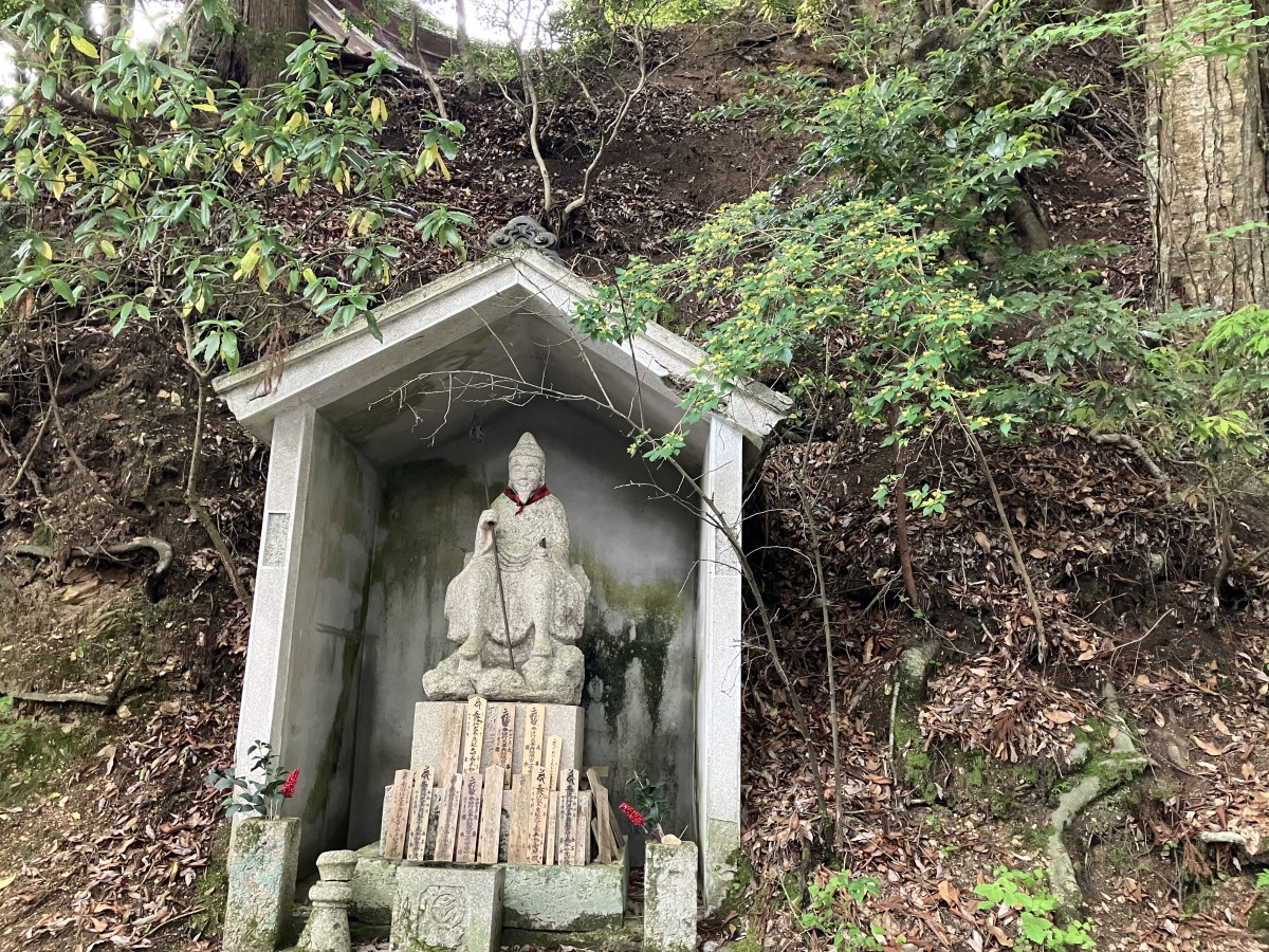 山道の途中には、長頭巾をかぶり、右手には杖、足元には下駄を履く役行者の姿が。役行者は、金峯山の山頂にあたる山上ヶ岳で、一千日間の参籠修行の末、金剛蔵王大権現を感得し修験道のご本尊とされたというお話も。