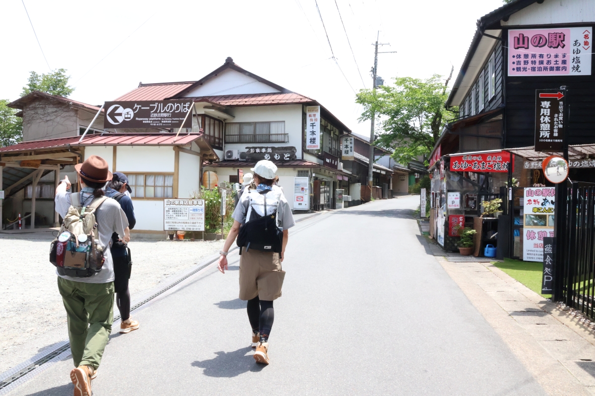 吉野山の玄関口となる、近鉄・吉野駅。ここからアスファルトの続く参道や、山道を行き来しながら、高城山展望台を目指していきます。歩行時間は片道約2時間。今回のルートは、トイレや給水スポットも多く、自然と歴史を散策しながらゆっくりと歩くことができるのも魅力のひとつ。