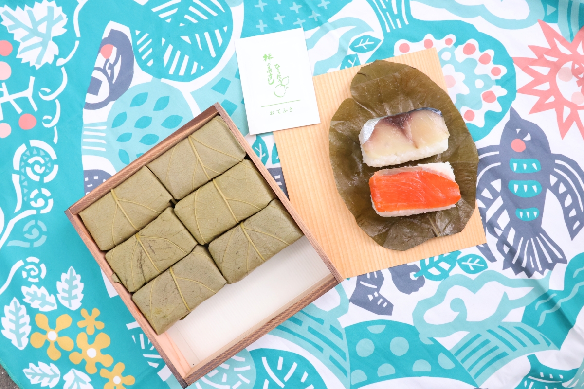 吉野山を歩くときのお昼ごはんにおすすめなのは、吉野の伝統の味「柿の葉すし」。塩鯖と鮭がセットになった「ひょうたろう」の柿の葉すしは、電話予約をして注文を。歩いて汗をかいた体に沁みるおいしさです。
