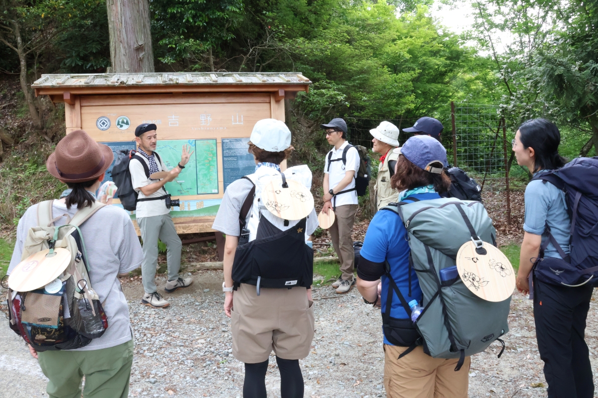 案内役の大内征さん(右)。イベントの拠点となる「YOSHINO GATEWAY」でハイトレイルを履いて、まずは吉野駅を目指して出発!この日が初登山という参加者も。「こまめに休憩をとりながら歩くことも、疲れにくい歩き方のポイントです」と大内さんからのアドバイスもあり、寄り道が多めの山旅になる予感です。