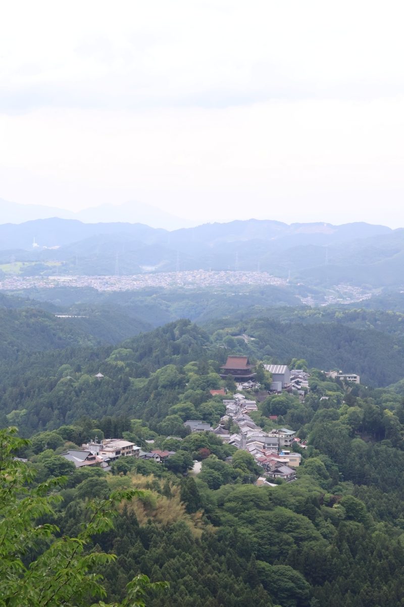 少しずつ山道を歩くパートも増えていくなか、途中、歩いてきた参道と金峯山寺を見下ろすことのできる場所が。春には、近鉄吉野駅付近から山上まで約3万本もの桜の木が開花し、いま見えているこの風景も桜色になるという。