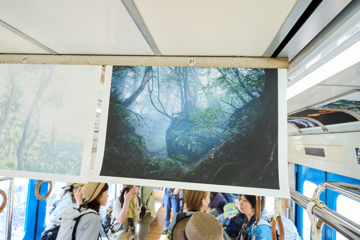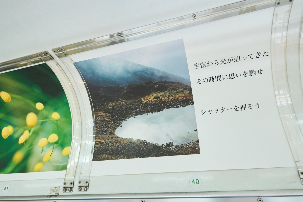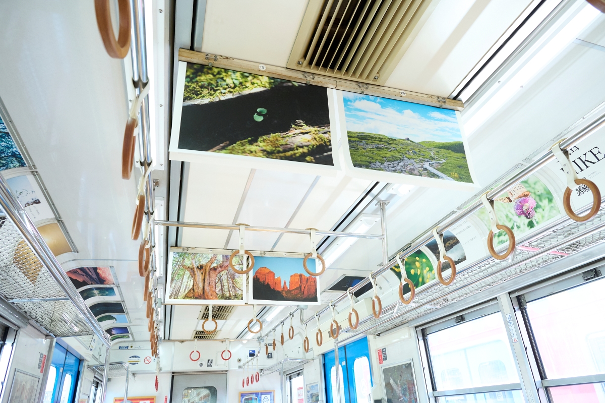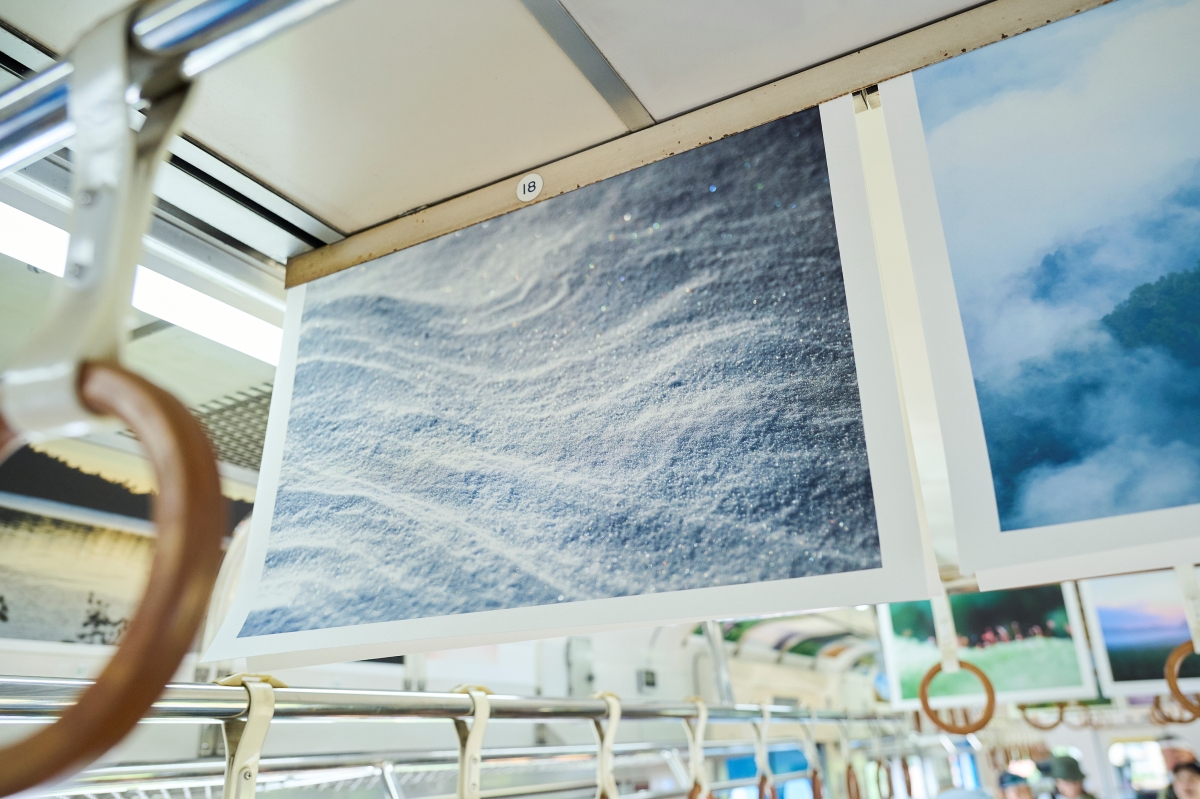 今回の写真展は富士急行の協力により、通常運行の一車両を貸し切って開催。中吊りやドア横、窓上の展示スペースに、約70点もの作品が並んだ。白色の美しさが際立つ特殊な紙にプリントされた写真が、木製の吊り革やフローリング、青いドア、車窓からの自然光や緑と調和し、唯一無二の空間を作り出していた。