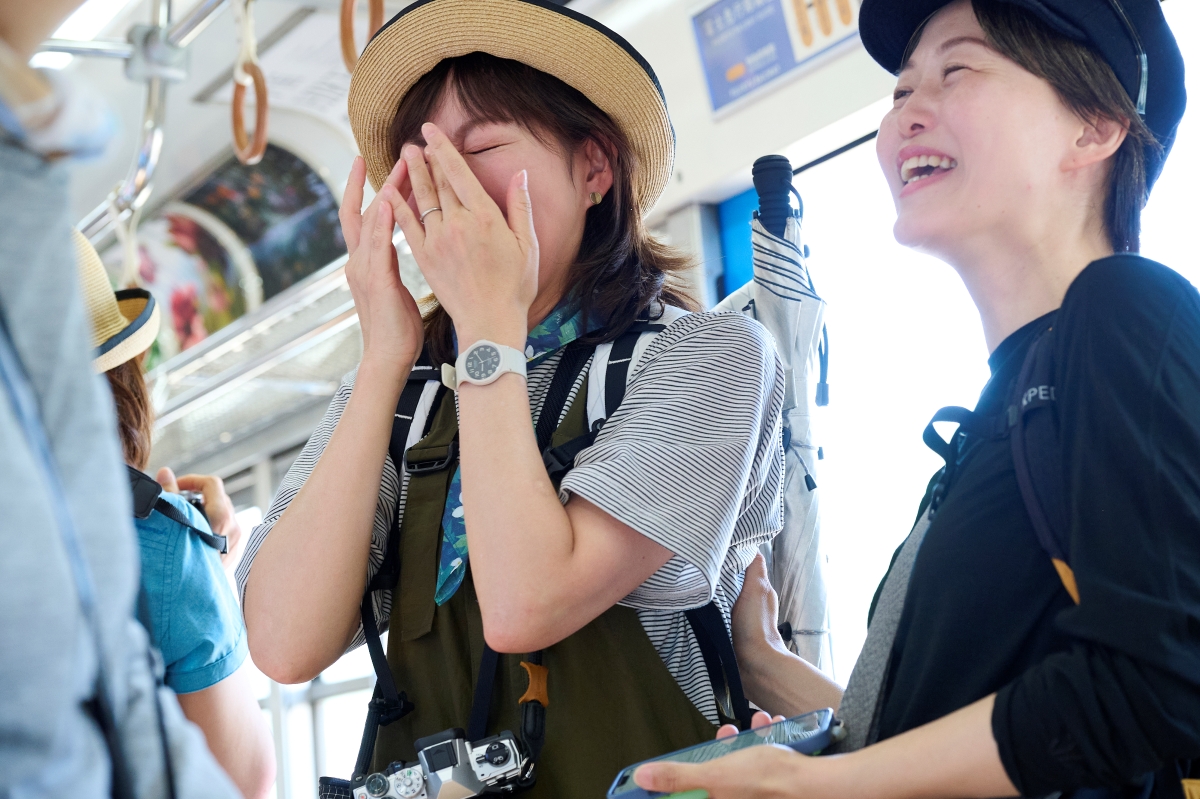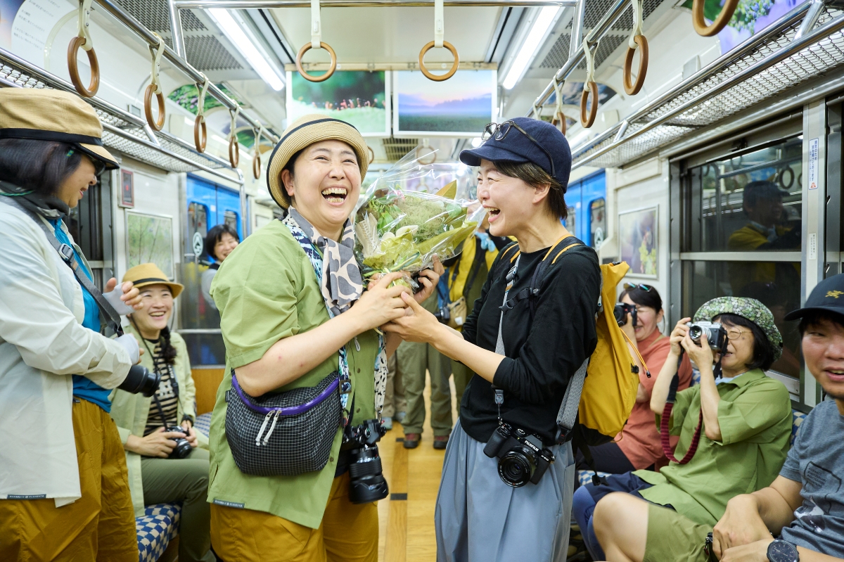 貸し切りの車内は終始、ワイワイとにぎやか。記念撮影をしたり、作品について質問や感想を伝えたり。前日に誕生日を迎えたメンバーに、茜さんから花束をプレゼントするサプライズも!