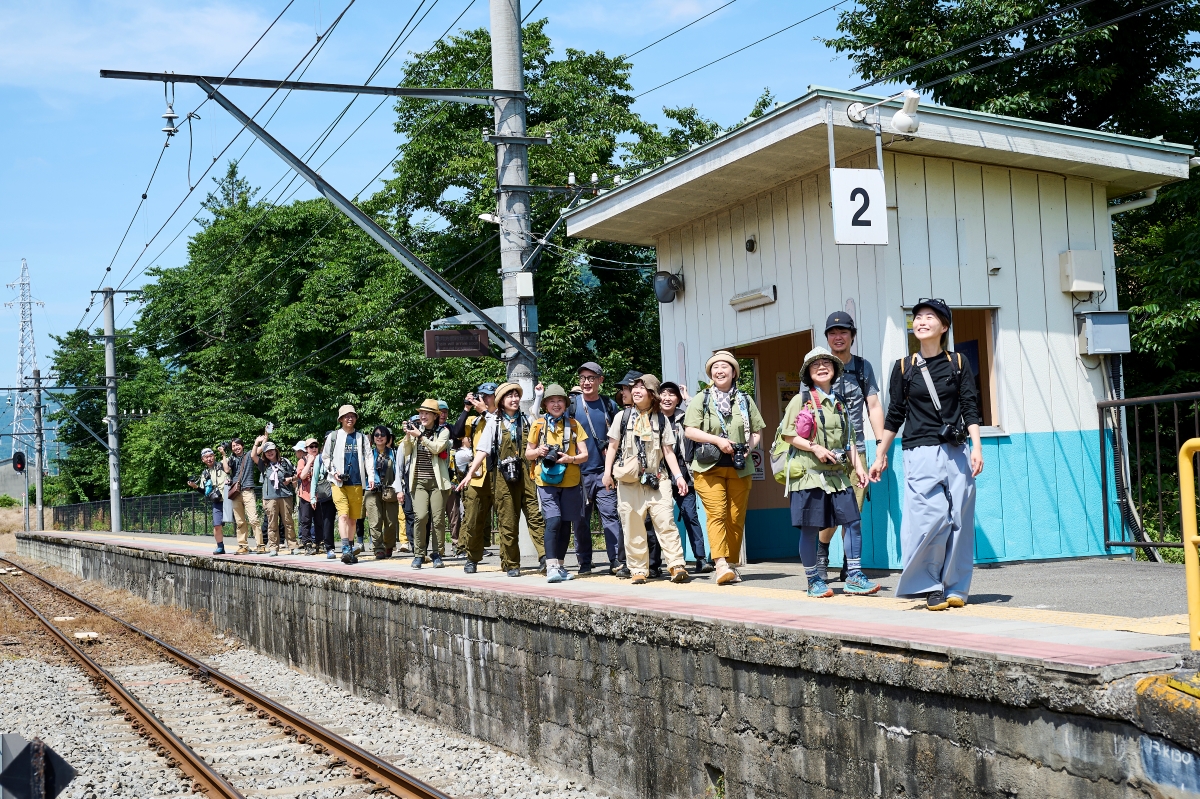 2025年6月21日(土)朝、大月駅に集まった約30名のメンバー。茜さんが撮影に携わるブランド「アクシーズクイン エレメンツ」全面協力のもと、色違いのシャツやパンツ、オーバーオールに身を包んでいた。