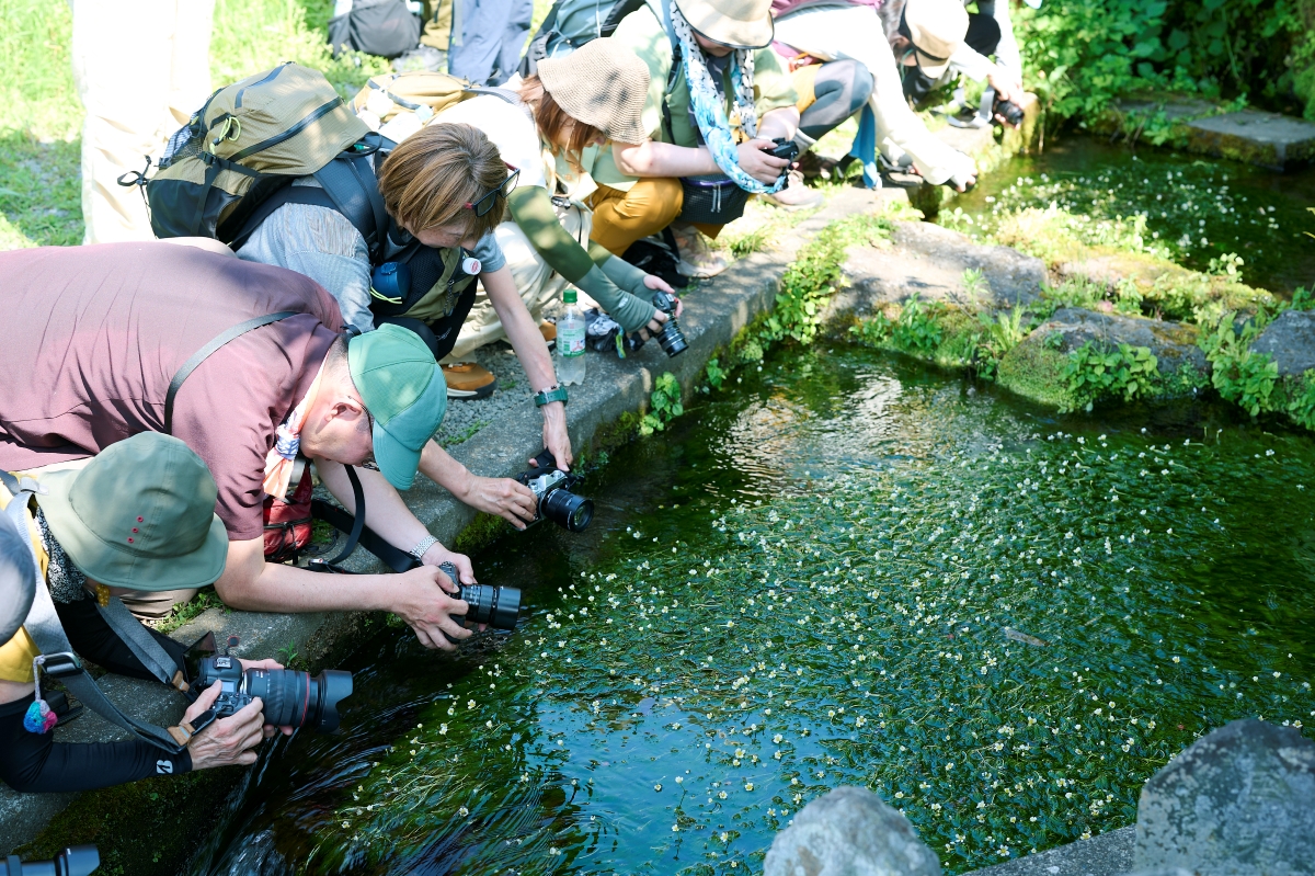 一行は東桂駅で下車し、フォトハイクがスタート。メンバーは、田んぼや滝、草花、水流など、あらゆる被写体を夢中で撮影し、なかなか前に進まない。でも、みんなマイペースに楽しんでいて、その表情は生き生き。