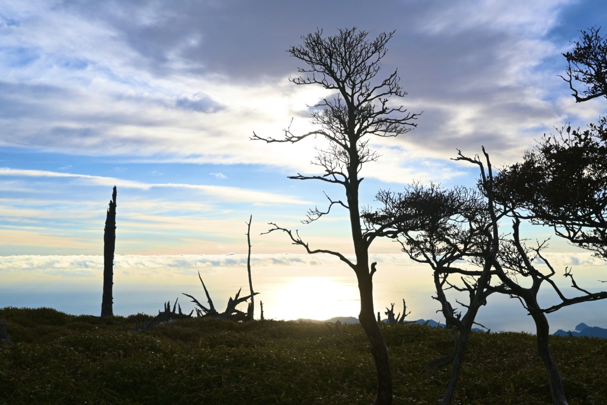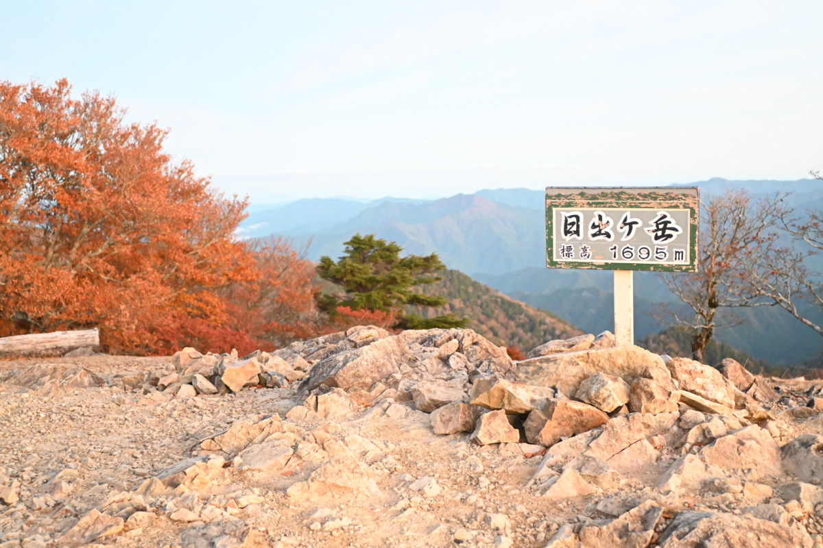 登り始めていくと、周囲が段々と明るくなり、最高点日出ヶ岳の看板が見えてきます。それと同時に朝日も昇り、辺り一面が神秘的な空間へ。