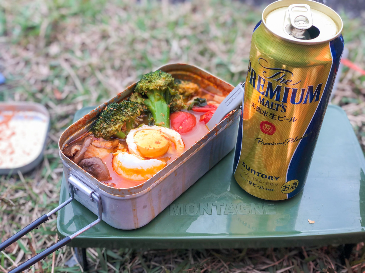 この日はソロで、巻機山のふもとキャンプ場にテントを張り前泊。夜ごはんは無印のトムヤムクンキットと、家で下ごしらえしてきた食材をメスティンへ入れるだけで簡単に。栄養バランスを考えた具材がたっぷりで、〆にフォーを入れていただきます。