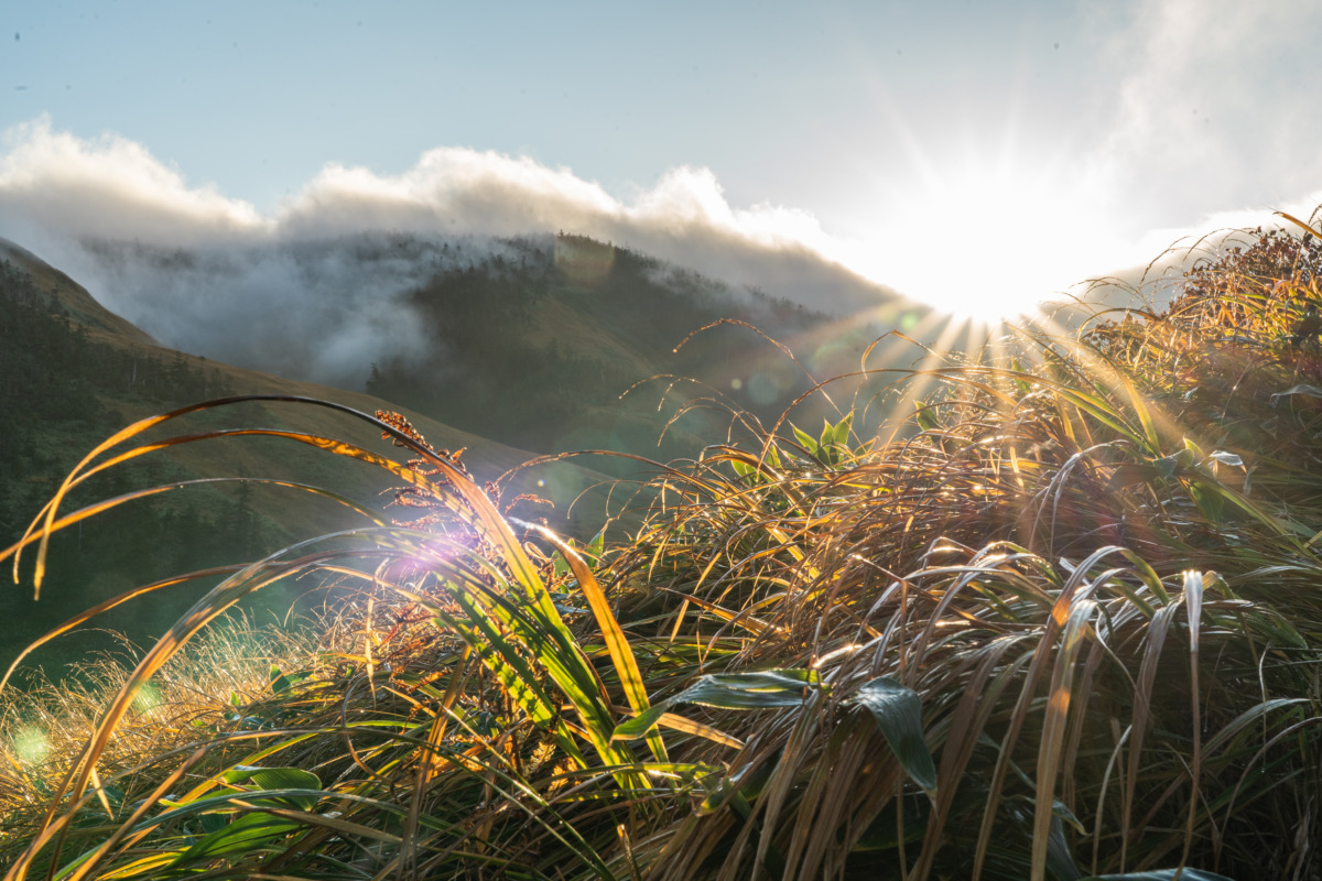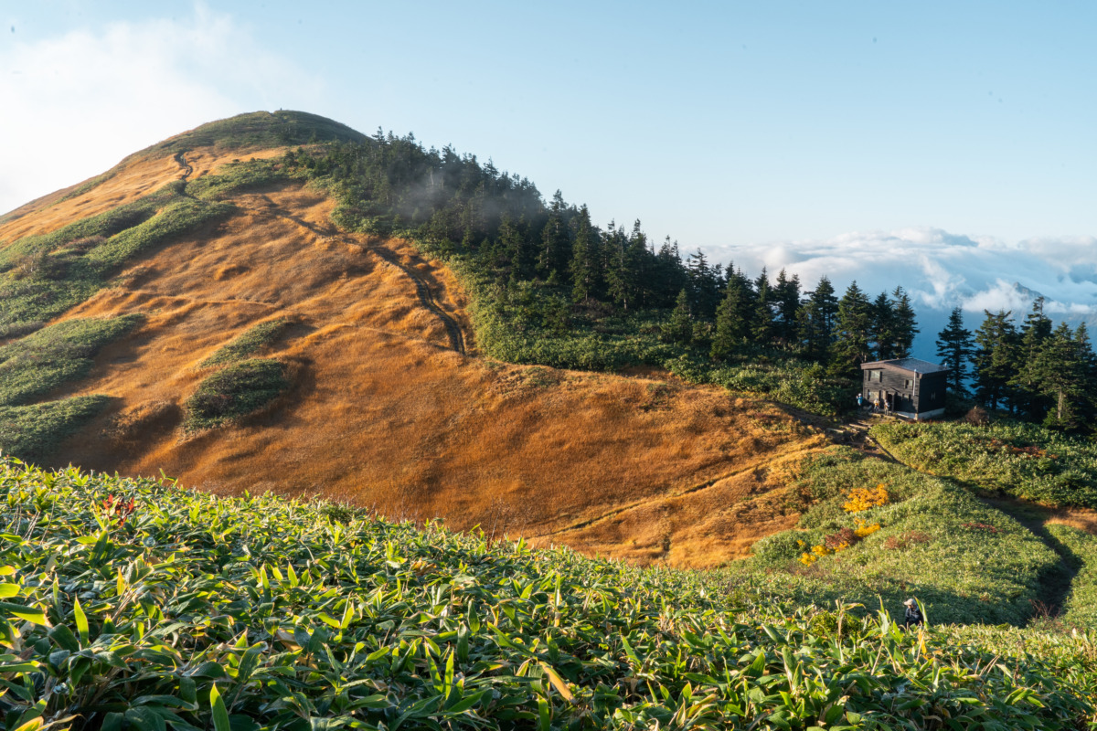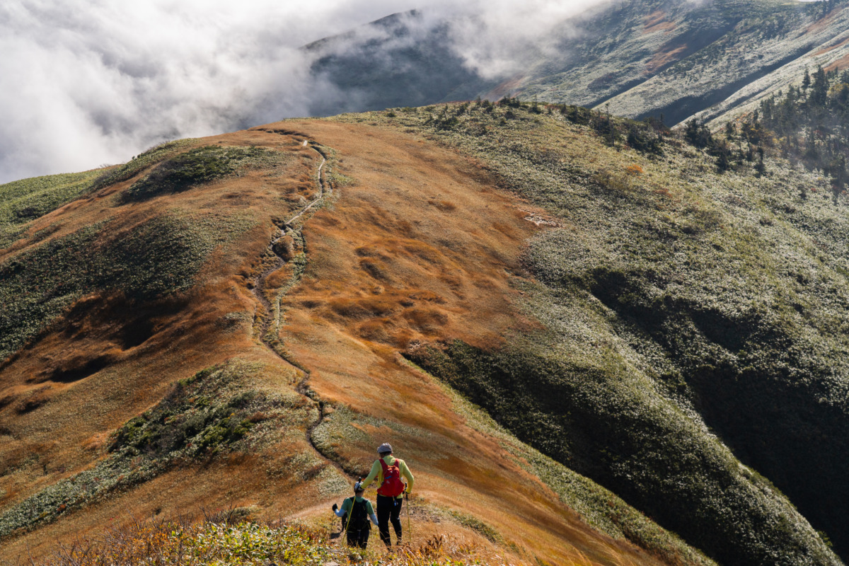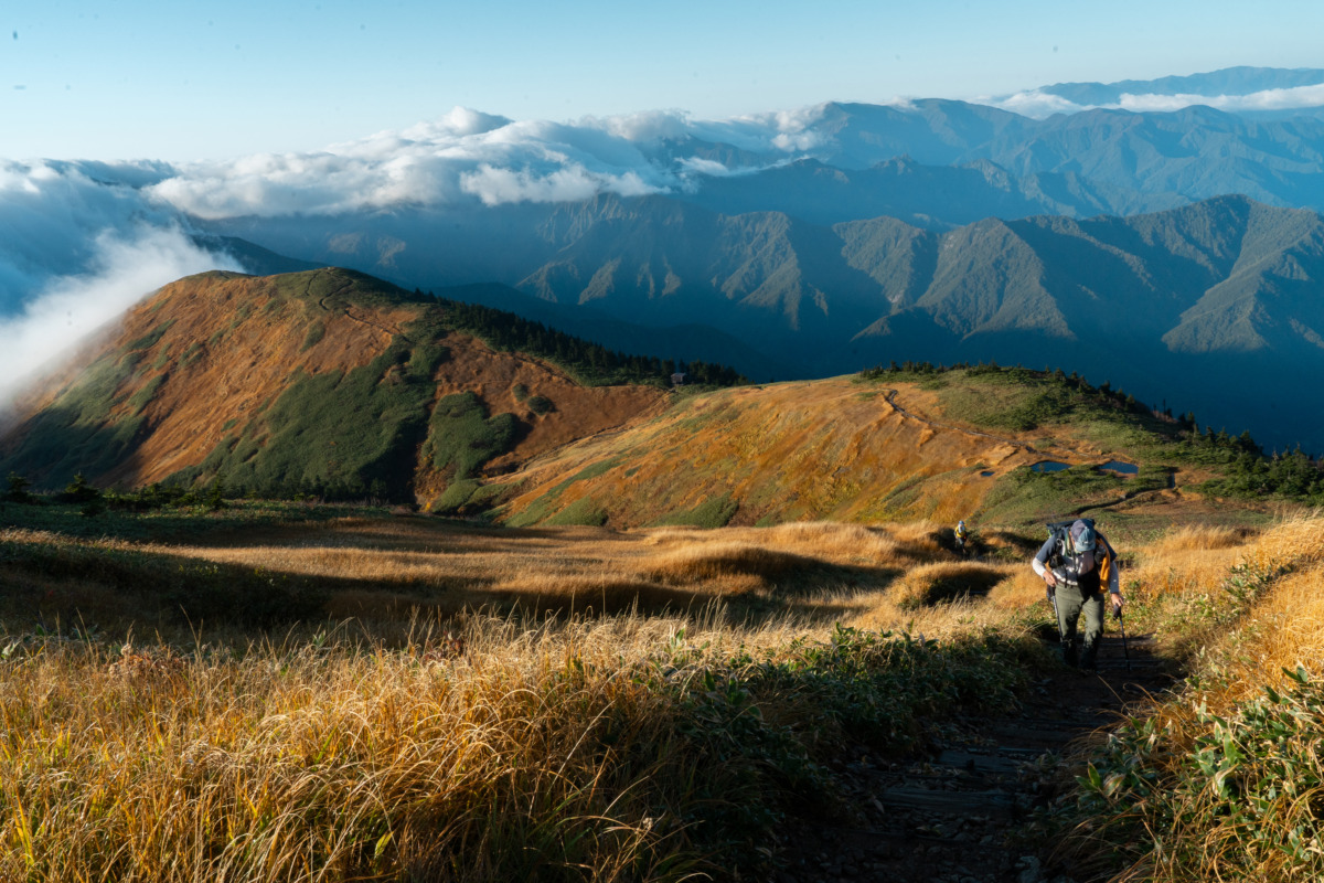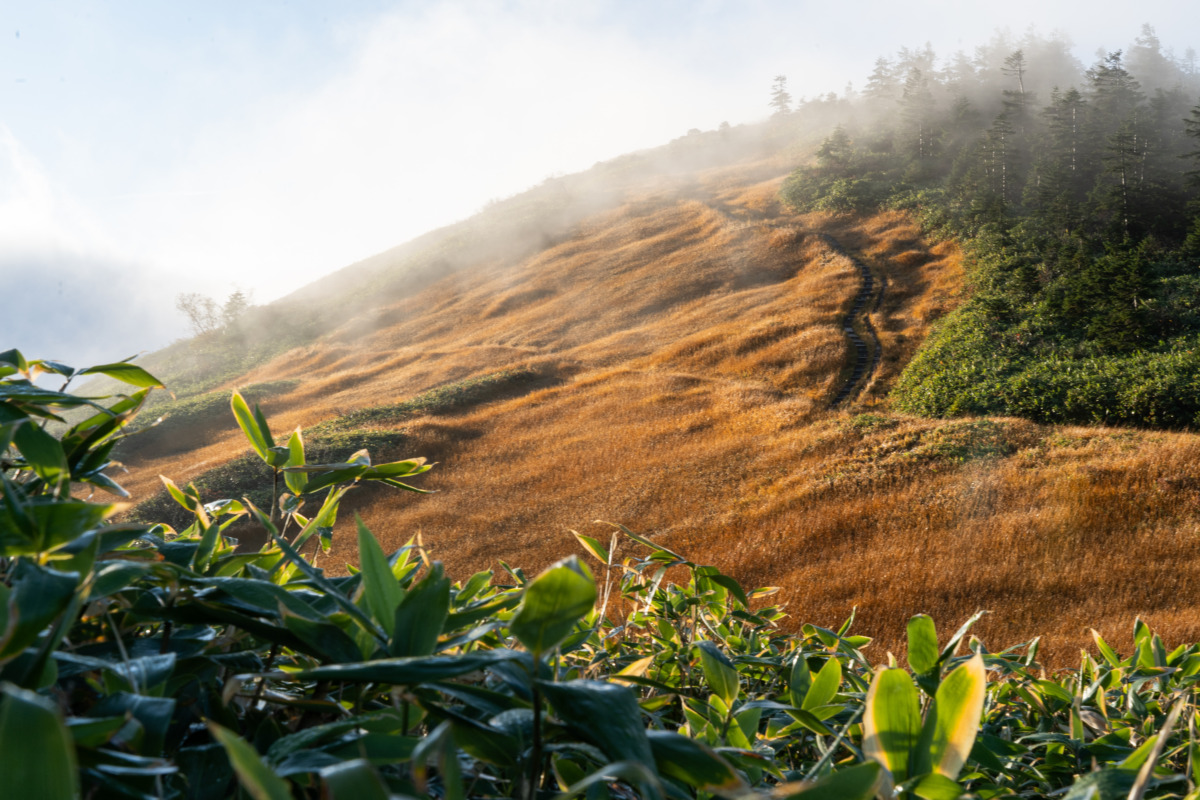 山のあいだから朝陽が差し込み、じわっと身体に血が巡るような感覚が。これはナイトハイクならではの体験だと思います。歩みを進めて避難小屋近くに来ると、ガスが抜けたことによって、もふもふの絨毯のような草紅葉が見えてきました。