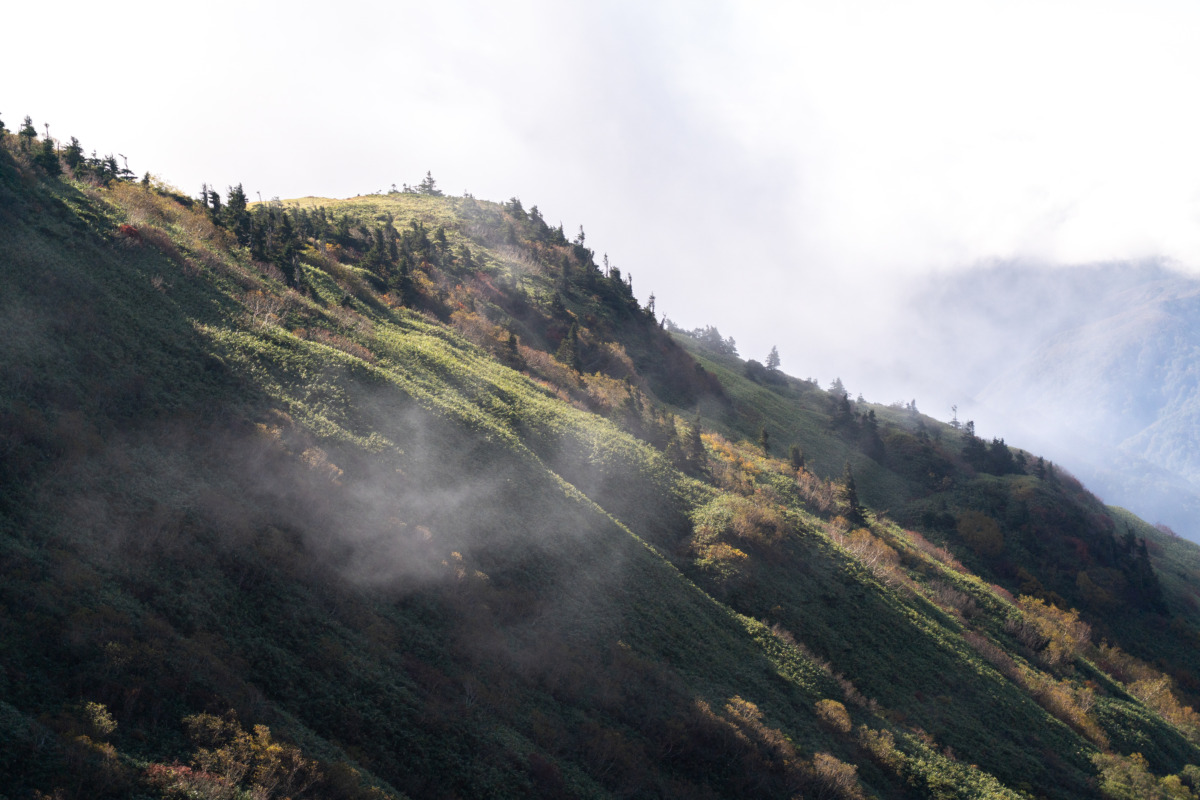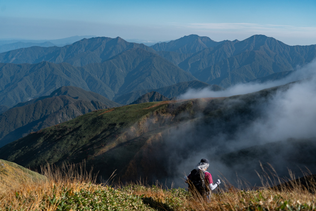 山は晴天すぎるよりも、雲やガスがあったほうが、山に奥行きが増す気がします。また歩行時間が長ければ長いほど、振り返ったときに自分が歩いてきた道がよく見えるとうれしいきもちになります。