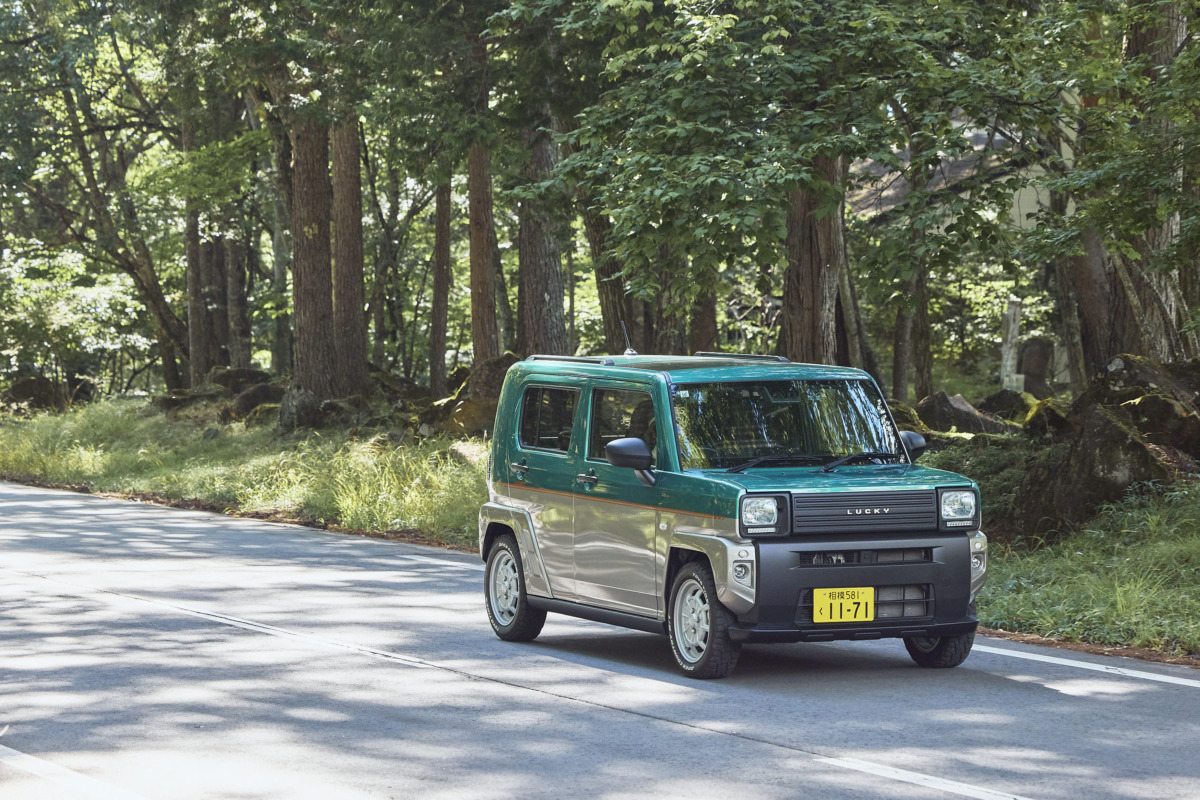 旅に選んだのは「ダムドTAFT LUCKY」。ニューレトロ/ネオクラシックの世界観をベースに、平成初期の一台をモチーフにした遊び心ある車だ。角目二灯のライトが印象をぐっと変え、かわいらしい印象に。