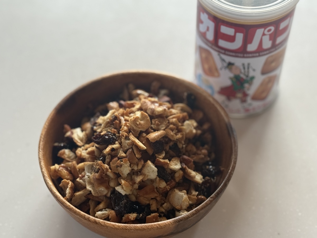 非常食の定番乾パンを、栄養が高い香ばしいグラノーラ風に大変身!そのまま食べても美味しいですが、牛乳や豆乳に浸してヨーグルトのトッピングにも、朝食やおやつにぴったりです。