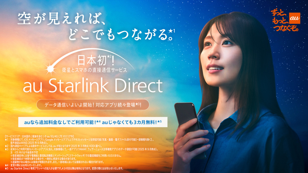 スペースX社が開発した最新鋭の低軌道Starlink衛星とスマートフォンが直接通信できるサービス。これまで電波が届かなかった山の中などでも、空が見える環境であれば衛星モードに自動で切り替わり、テキストメッセージやAIチャットなどが使用できる。また、iPhone、Androidの対応機種では、YAMAPやウェザーニュースなど一部アプリでのデータ通信も可能になる。※3  https://www.au.com/brand/tsunagu/starlink/