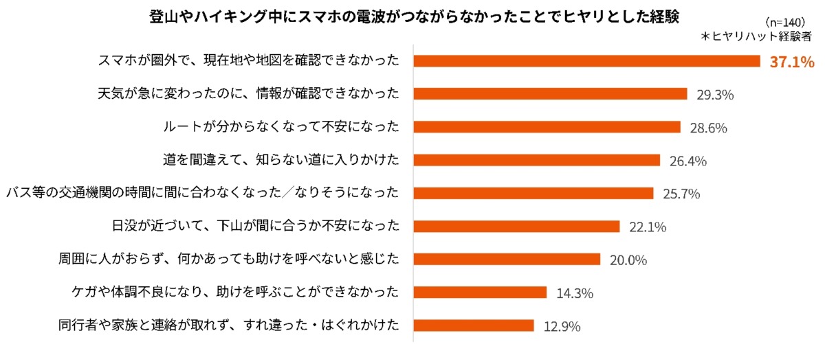 安仁屋 この調査によると「登山・ハイキング中にスマホの電波がつながらずヒヤリとした経験がある」人の割合は28%。その内容を見ていると、「スマホが圏外で、現在地や地図を確認できなかった」(37.1%)、「天気が急に変わったのに、情報が確認できなかった」(29.3%)、「ルートがわからなくなって不安になった」(28.6%)などが並んでいます。自由回答では「登山ルートが確認できなくて遭難しかけた」や「子どもが脇道にそれて姿を見失った。数分後に見つかったが、GPSが機能せず焦った」など、危険なシーンも。そもそも、スマホがつながらないだけでヒヤリとしている人が4人に1人以上の割合でいることに驚きましたし、少し心配になります。