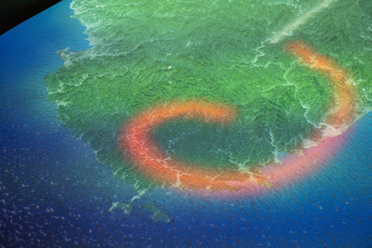 3日目の午前は本州最南端に位置する南紀熊野ジオパークセンターへ。入ってすぐの床面に南紀熊野エリアの大きな地図が描かれていて、ガイドさんが地形の成り立ちを説明してくれた。