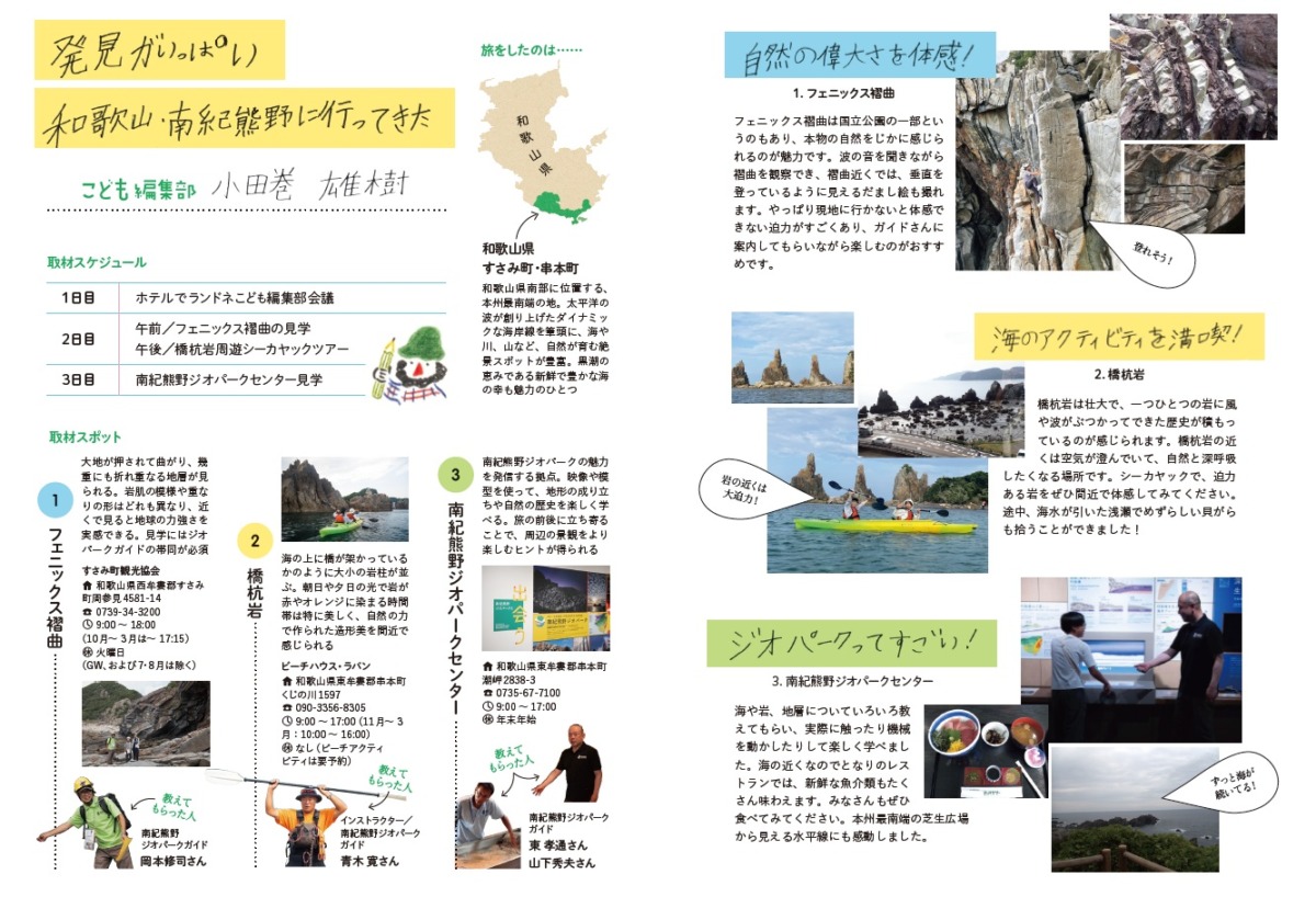 「ランドネこども編集部」が、和歌山の南紀熊野エリアへ出発! 親子で旅をしながら、取材手帳とカメラを手に本物の編集部員として挑戦しました。岩が語る地球の歴史にふれたり、海の幸を味わったり、シーカヤックで絶景に漕ぎ出したり――。学びと発見がいっぱいの3日間を記録した「こども新聞」も完成しました!