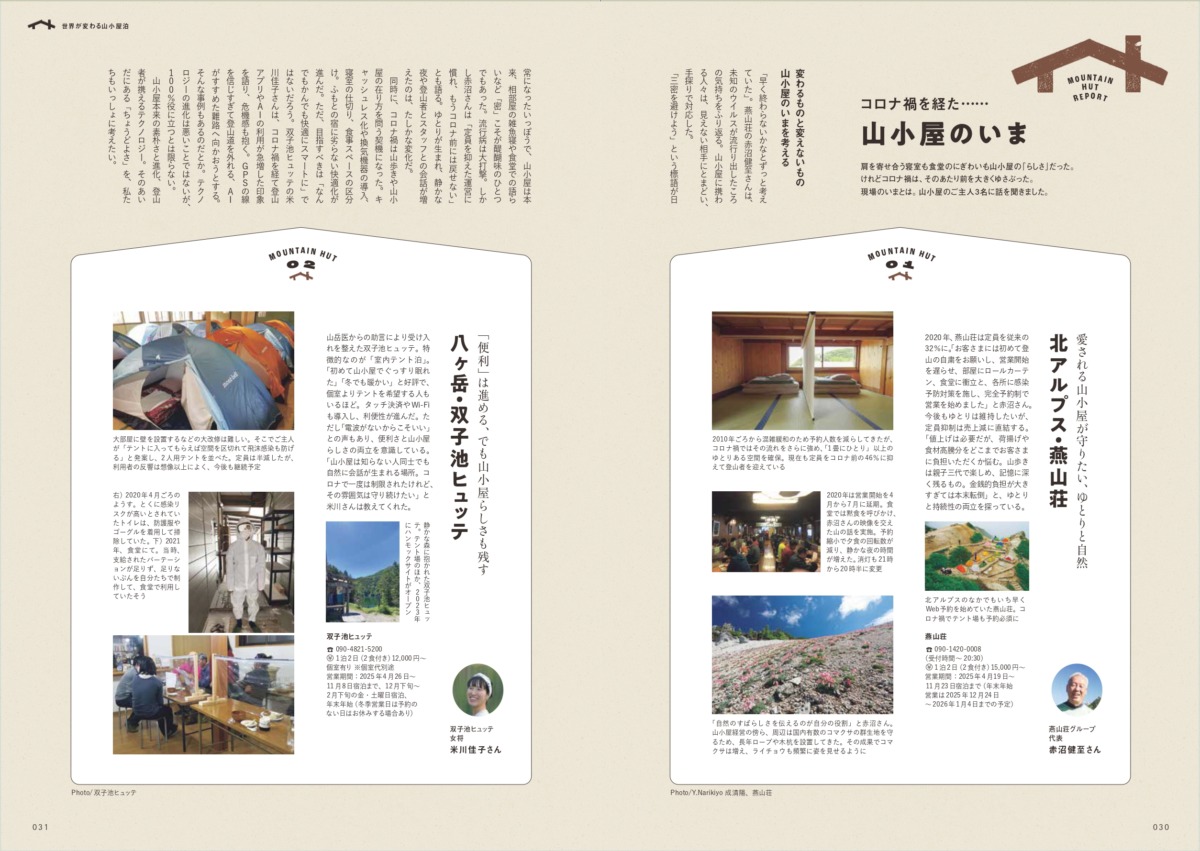 ▲コロナ禍を経て、山小屋は新しい姿を見せています。北アルプス・燕山荘の“静かな夜”、八ヶ岳・双子池ヒュッテの室内テント泊やキャッシュレス化、富士山・太子舘の安心感ある寝床と換気設備。それぞれの工夫の裏には、山小屋を守り続けるご主人たちの思いがありました。