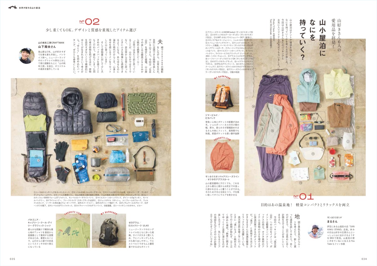 ▲山小屋泊はテントや寝袋を持たないぶん、なにを持っていくかを考えるのが楽しみ。温泉を目指すリラックス重視の装備、デザインや質感にこだわった道具、気分を上げるカラーアイテムや長く使い込んだ相棒まで、工夫は人それぞれ。山好きさん6人のパッキングをのぞけば、思わず山道具に手を伸ばしたくなります。