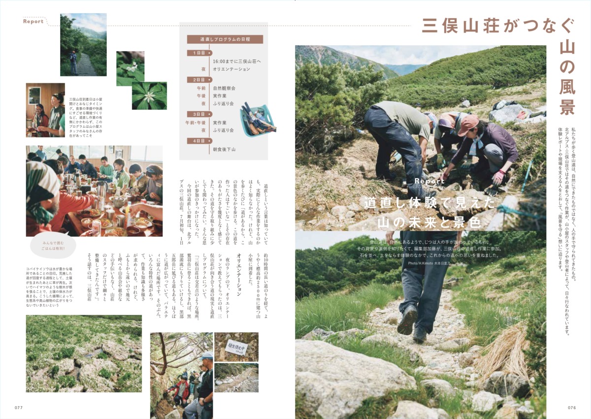 ▲北アルプス・三俣山荘で行われている「道直しプログラム」。登山道は自然にあるようで、じつは多くの人の手で守られてきました。石を運び並べ、雨水の流れを考えながら道を整える作業は、小さな一歩が未来の景色につながる体験。参加者の声からは、山を歩くことの重みや自然へのまなざしが伝わってきます。山を歩く一歩の重みを知ることで、次に目にする風景が少し違って見えるかもしれません。