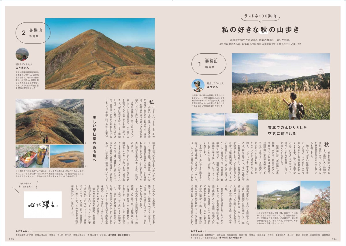 ▲秋の山は、澄んだ空気と紅葉に包まれる特別な季節。磐梯山では猪苗代湖の絶景、巻機山では黄金色の草紅葉と星空に心が躍ります。大杉谷は岩壁と清流の迫力、大台ヶ原ではご来光のパノラマに出合えるひとときも。彩り豊かな景色にふれる秋山歩き――次の休み、あなたはどの山を目指しますか?