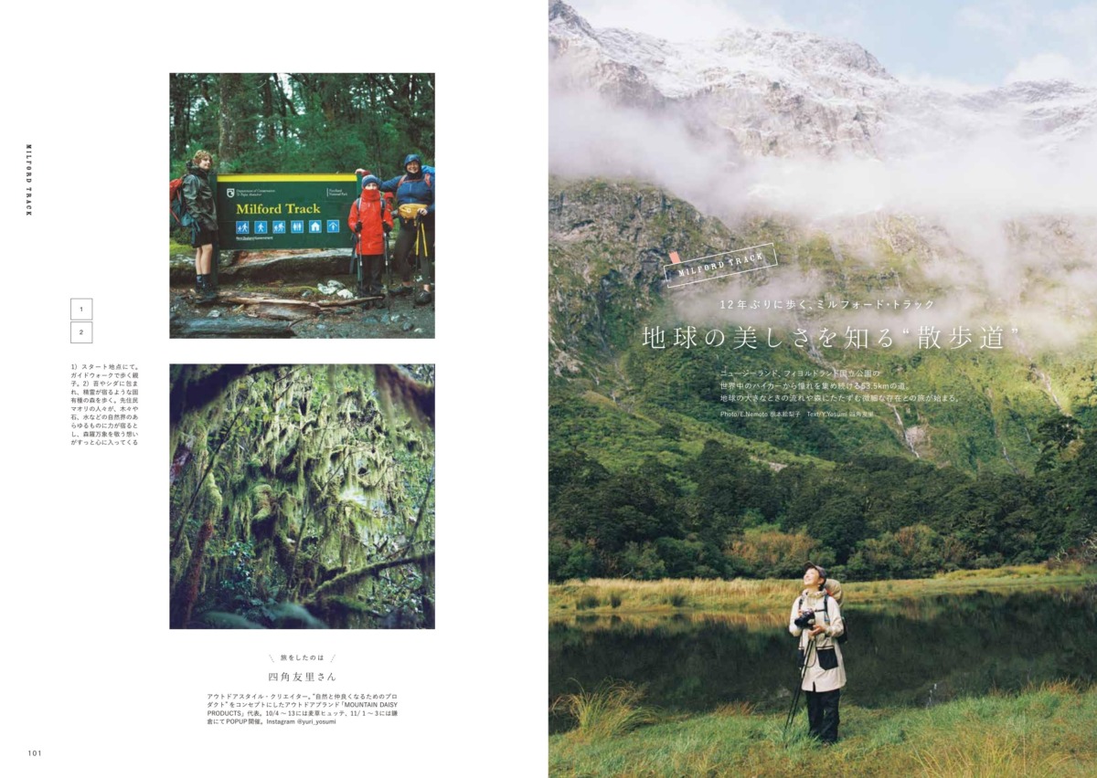 ▲世界中のハイカーが憧れる、ニュージーランド・フィヨルドランド国立公園のミルフォード・トラック。全長53.5kmの道には、苔むす森や氷河の谷、固有種の花々、そして無数の滝が続きます。旅したのはアウトドアスタイル・クリエイターの四角友里さん。霧に包まれたマッキノン峠や黄金色に輝く草原など、神々しい風景に出会いながら、4日間のトレイルを歩いた記録を紹介しています。