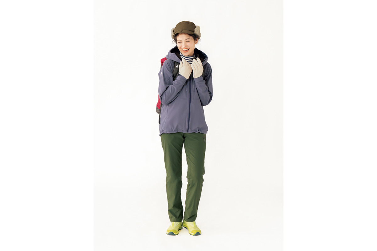 行動中に寒くなりそうな場合は、防風・保温だけでなく、ストレッチ性や通気性も備えたソフトシェルジャケットが活躍。インナーには保温性と速乾性を兼備したメリノウールプラスを。全身を落ち着いたカラーでまとめつつ、小物を差し色にした上級者コーデ。