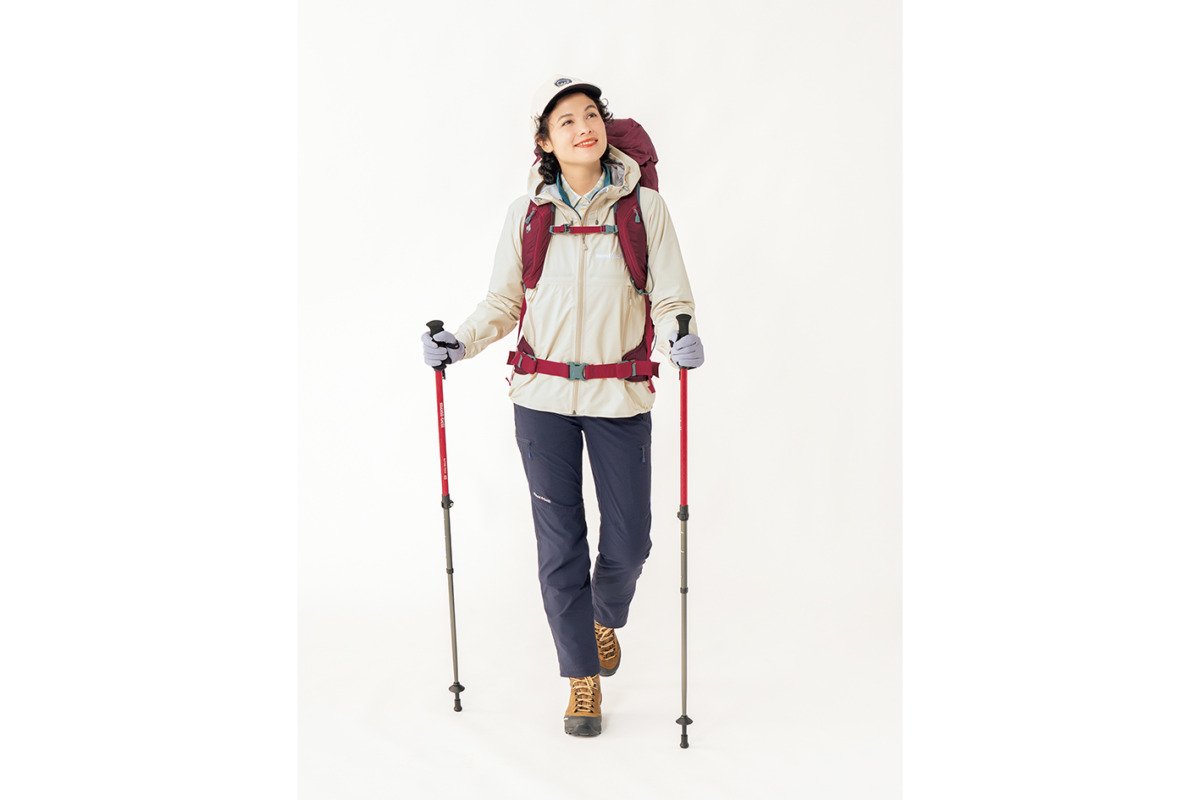 防水性、透湿性、耐久性を備えたレインジャケットは、防寒・防風のアウターとしても活用できる。メリノウールの山シャツと、軽量コンパクトな保温着を重ねることで、行動中の温度差に合わせて脱ぎ着がしやすいレイヤリングの完成。白と赤のコーデで冬らしさも演出。