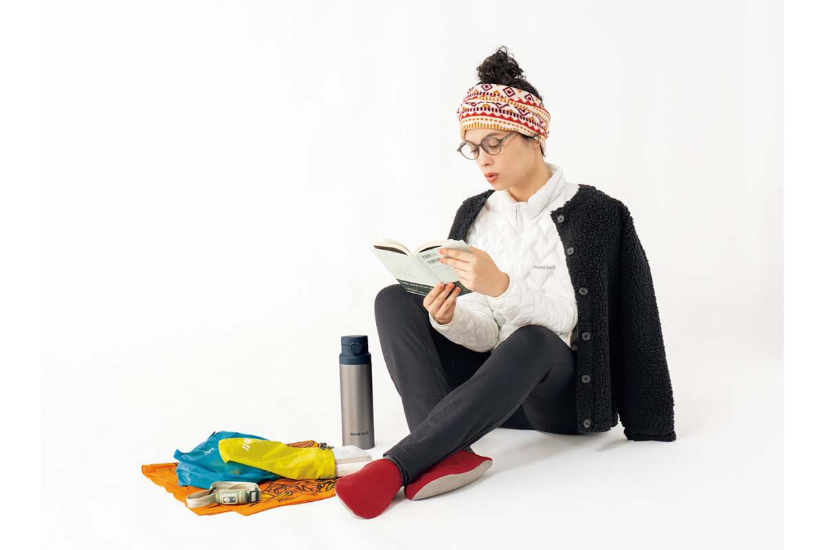 山小屋内が寒そうなときや、外に日没や日の出を見にいくときは防寒着をしっかりと用意。軽量で保温性の高い1000フィルパワーのダウンに、裏地に防風性のある厚手フリースを重ねて。厚手のタイツは1枚でも、インナーとしても使える。モノトーンでまとめてクールな印象に!